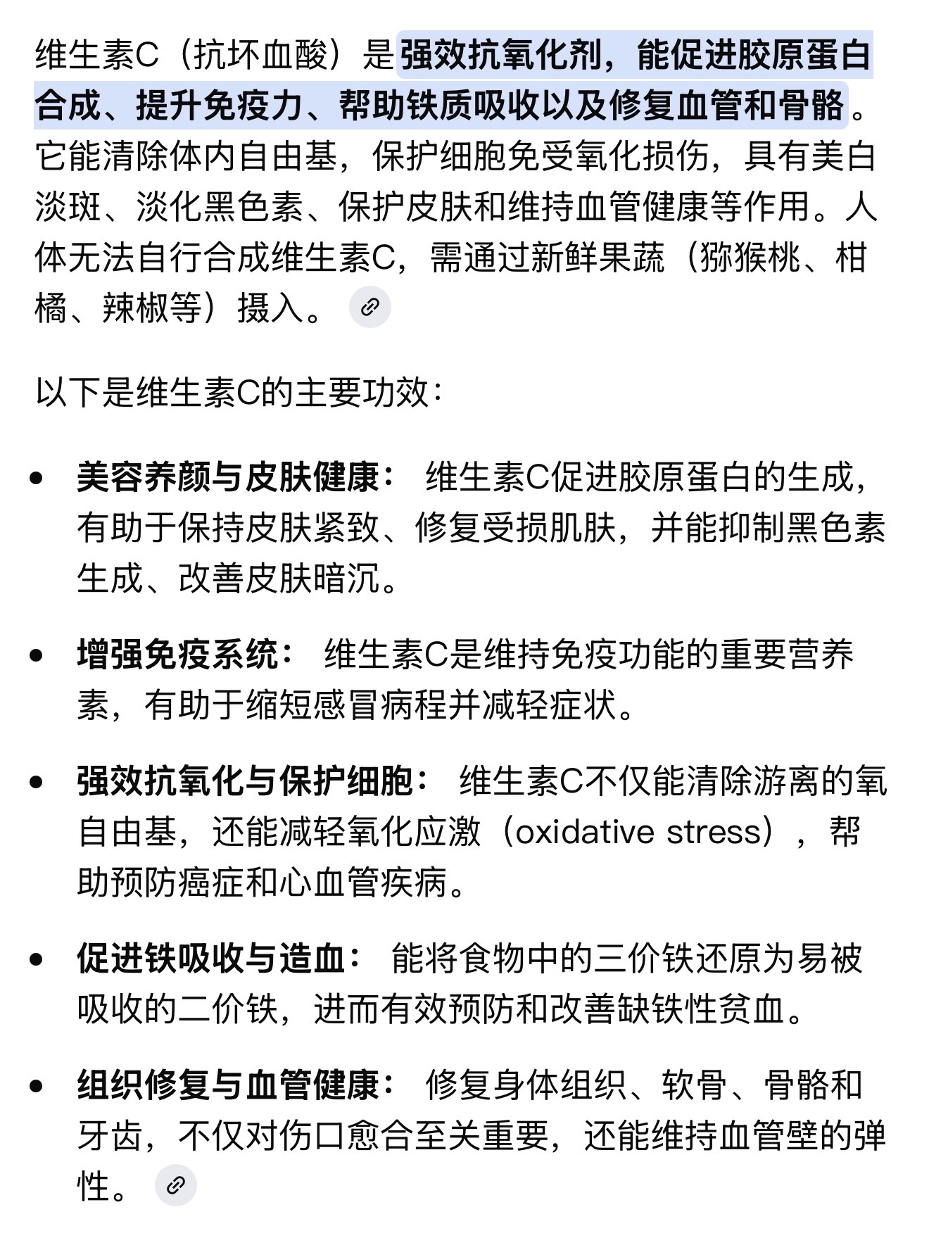 维生素C(抗坏血酸)是强效抗氧化剂,能促进胶原蛋白合成、提升免疫力、帮助铁质吸收以及修复血管和骨骼。它能清除体内自由基,保护细胞免受氧化损伤,具有美白淡斑、淡化黑色素、保护皮肤和维持血管健康等作用。人体无法自行合成维生素C,需通过新鲜果蔬(猕猴桃、柑橘、辣椒等)摄入